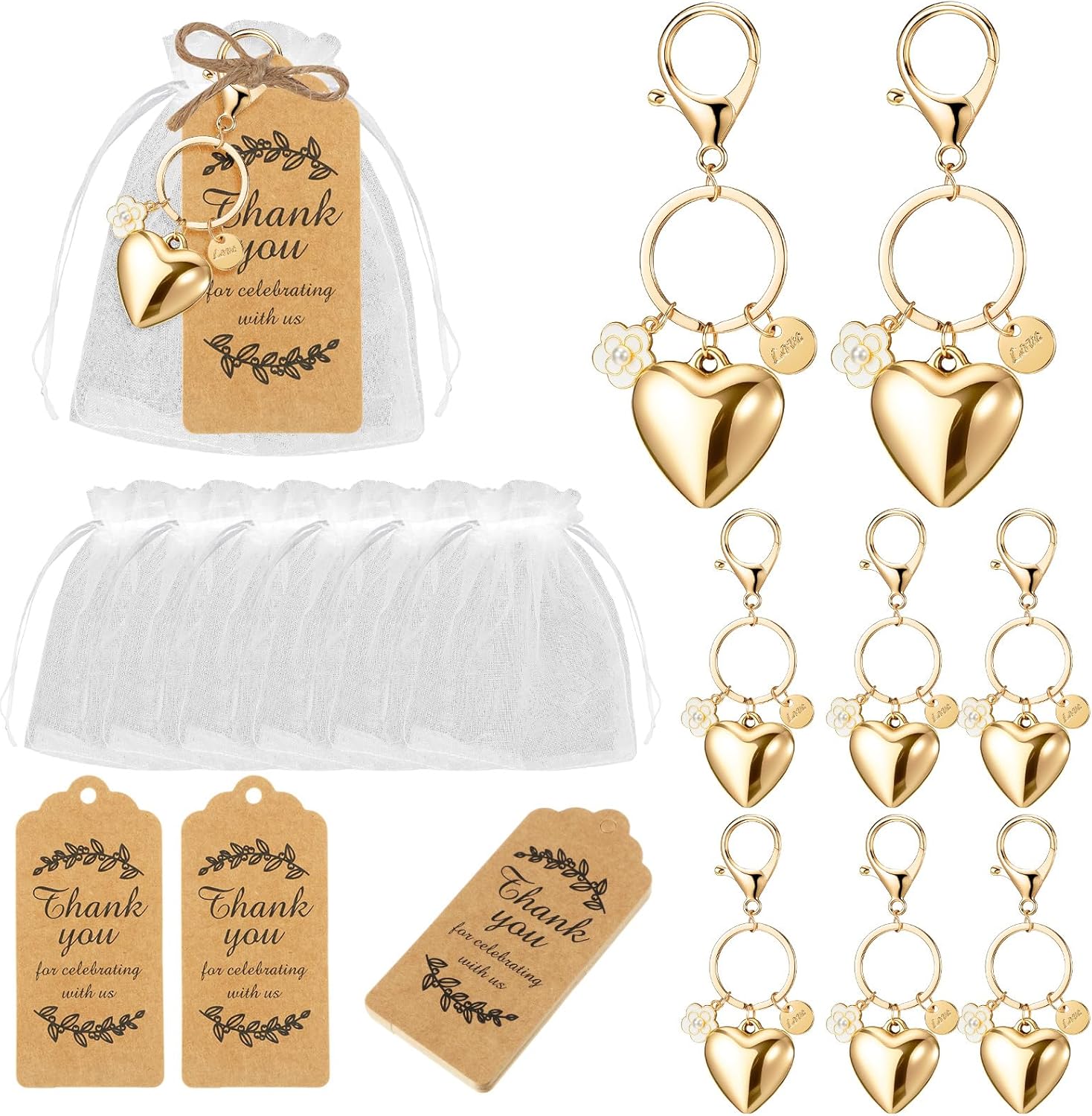 These heart keychains are more than just accessories. Paired with thank you tags and encased in white organza bags, they serve as elegant cherry decorations that add a personal touch to your event, making your guests feel special and appreciated.