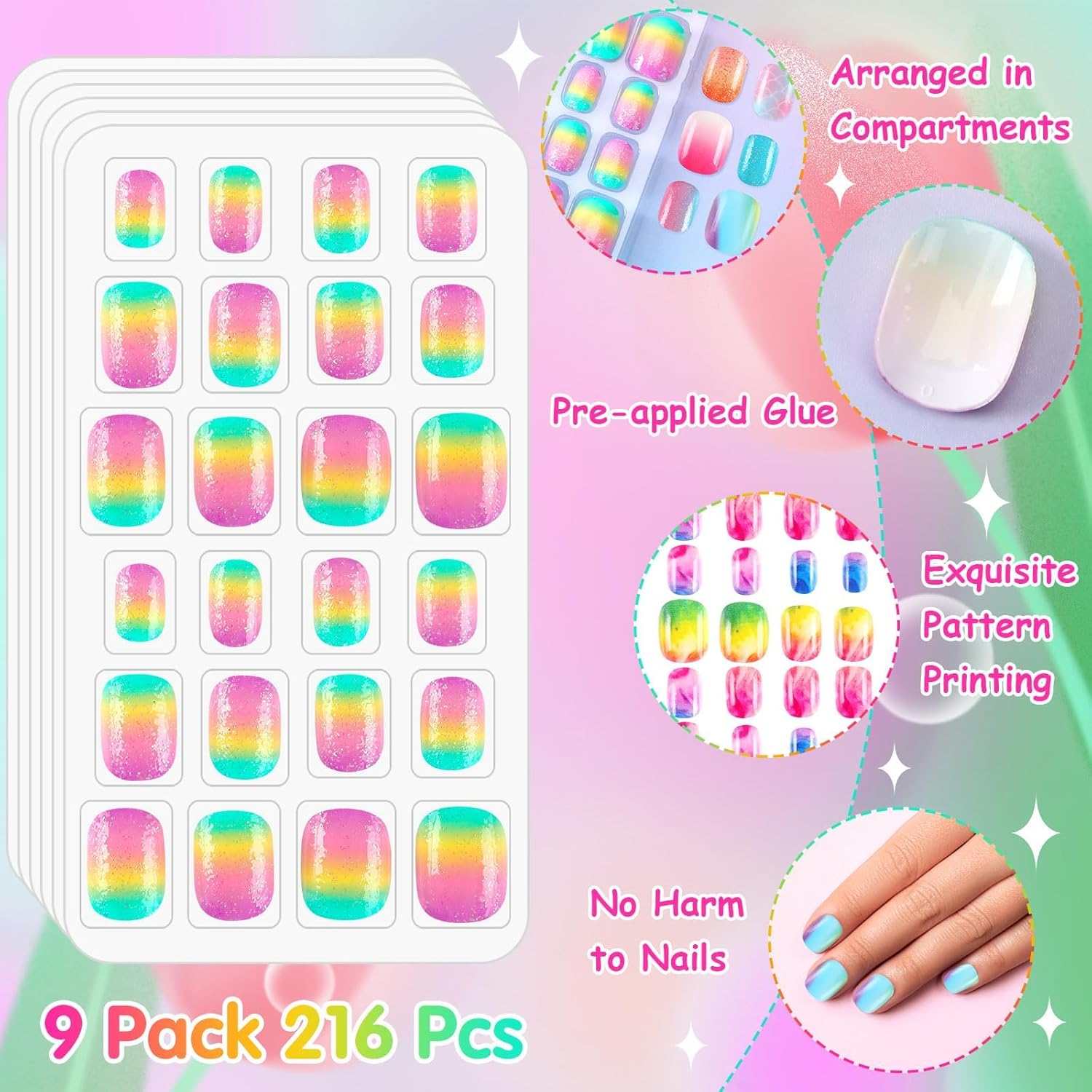 Package Content:Each box contains 24 gradient style stick on nails for kids, 9 boxes, a total of 216 pieces, each press on nails for kids feature unique charm, colorful, whether for daily wear or holiday dress, these carefully designed press on nails can add extra charm to children’s clothing