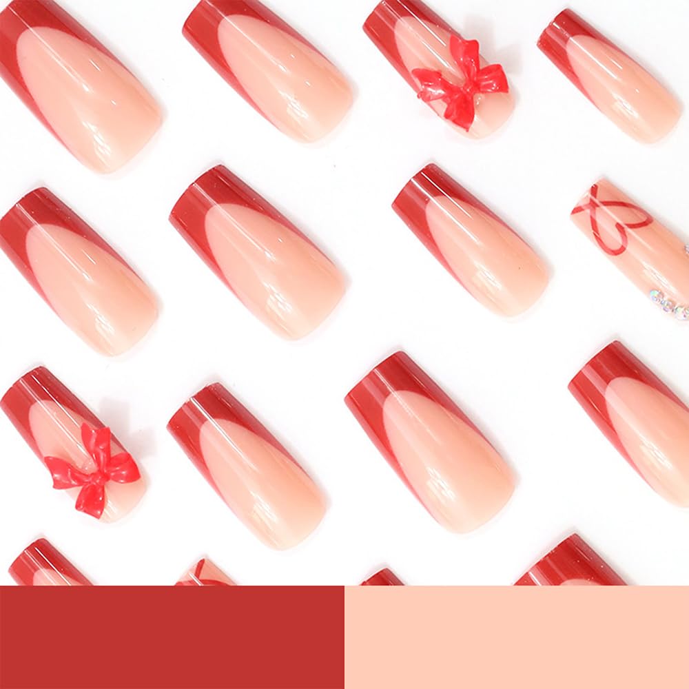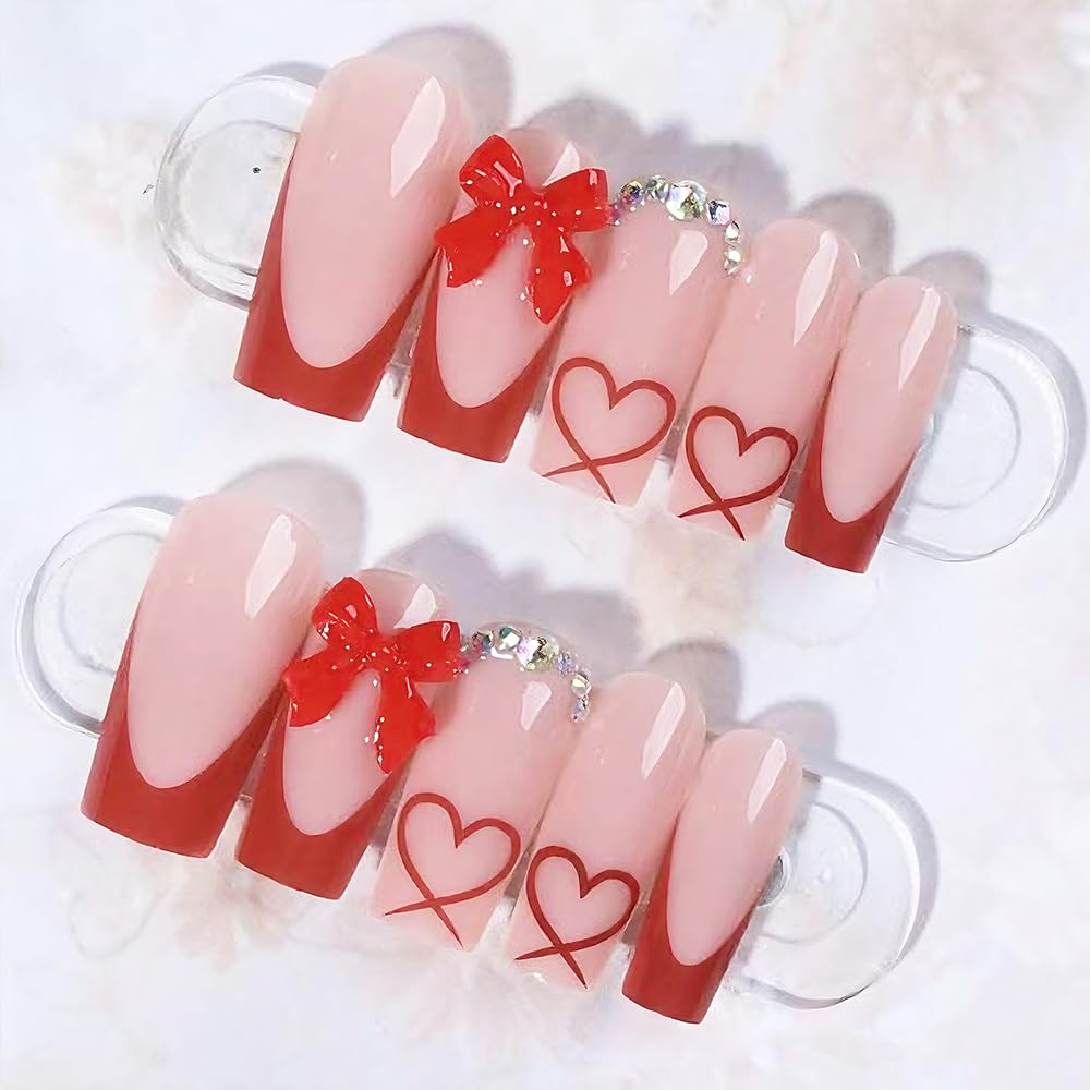 ELEGANT FRENCH TIP DESIGN: Features a classic nude pink base with glossy red French tips, adorned with charming 3D red bow accents, rhinestones, and pearl embellishments