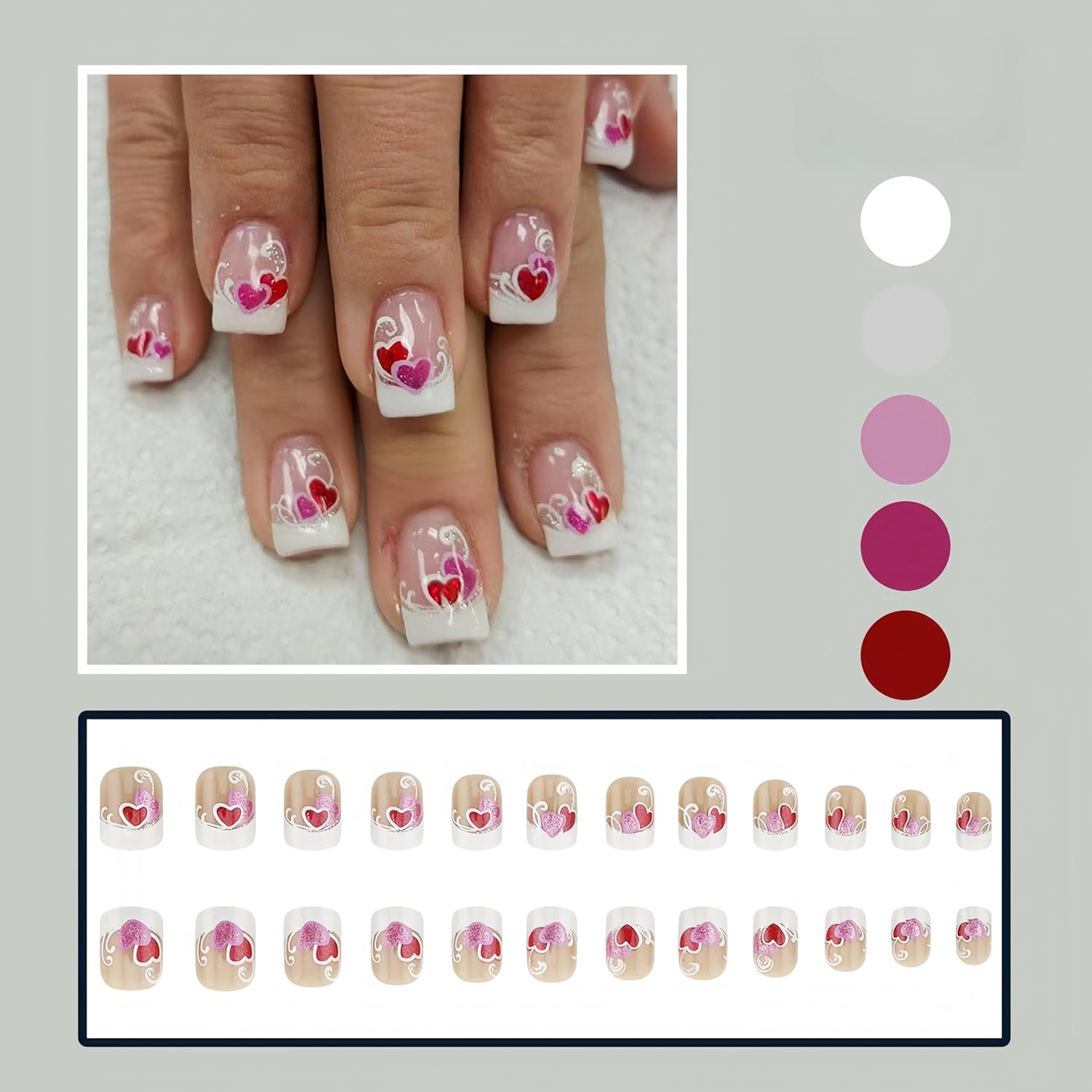Package Contains:A box contains 24 Valentine’s Day heart fake nails, a nail file and 24 jelly glues, an alcohol cotton pad,1 wooden stick,the fake nails are divided into 12 different sizes, it is convenient for you to choose the fake nails that suit your nail