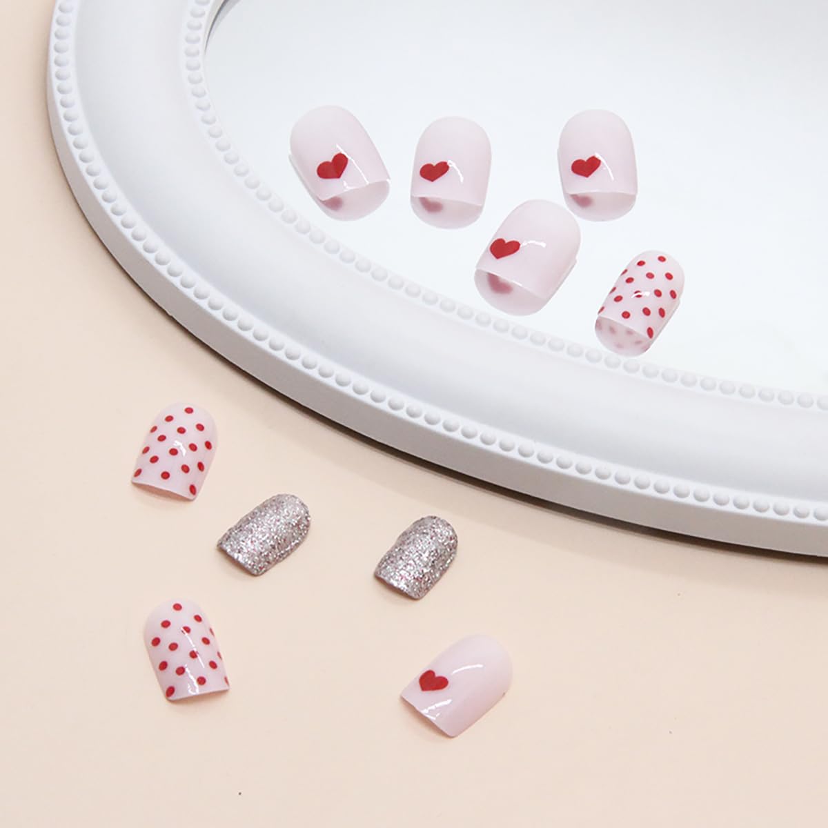 Nail Art Decoration: 24Pcs Valentines short false nails, 24 pieces of jelly glue, 1 mini nail file, 1 wooden stick. Heart fake nails can get your favorite manicure in just 5 minutes without waiting at the nail salon