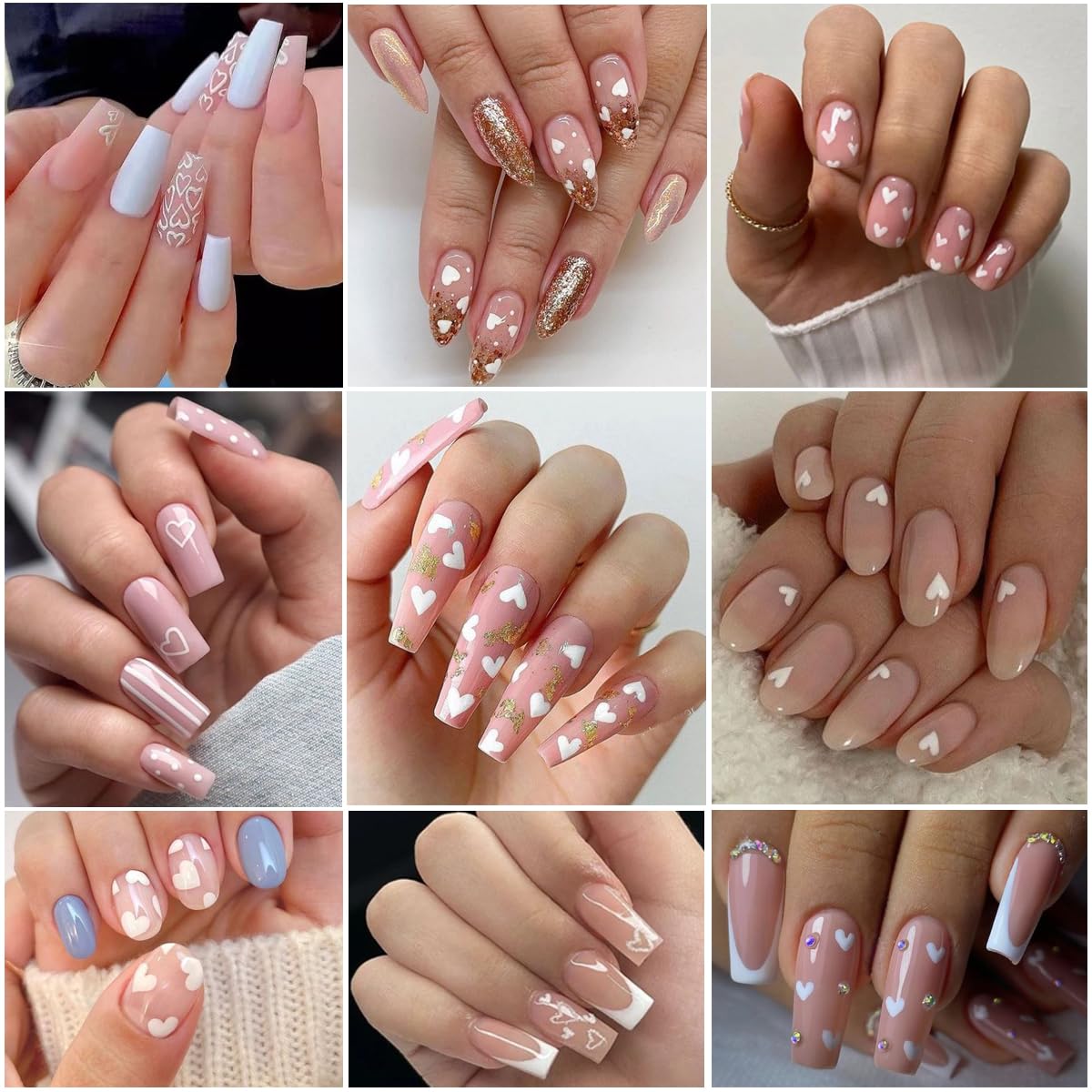 Heart Nail Decor: This hearts nail art sticker set includes 8 sheets of heart nail stickers, special heart shape designs, with white colors, enough patterns bring you more nail DIY choices.