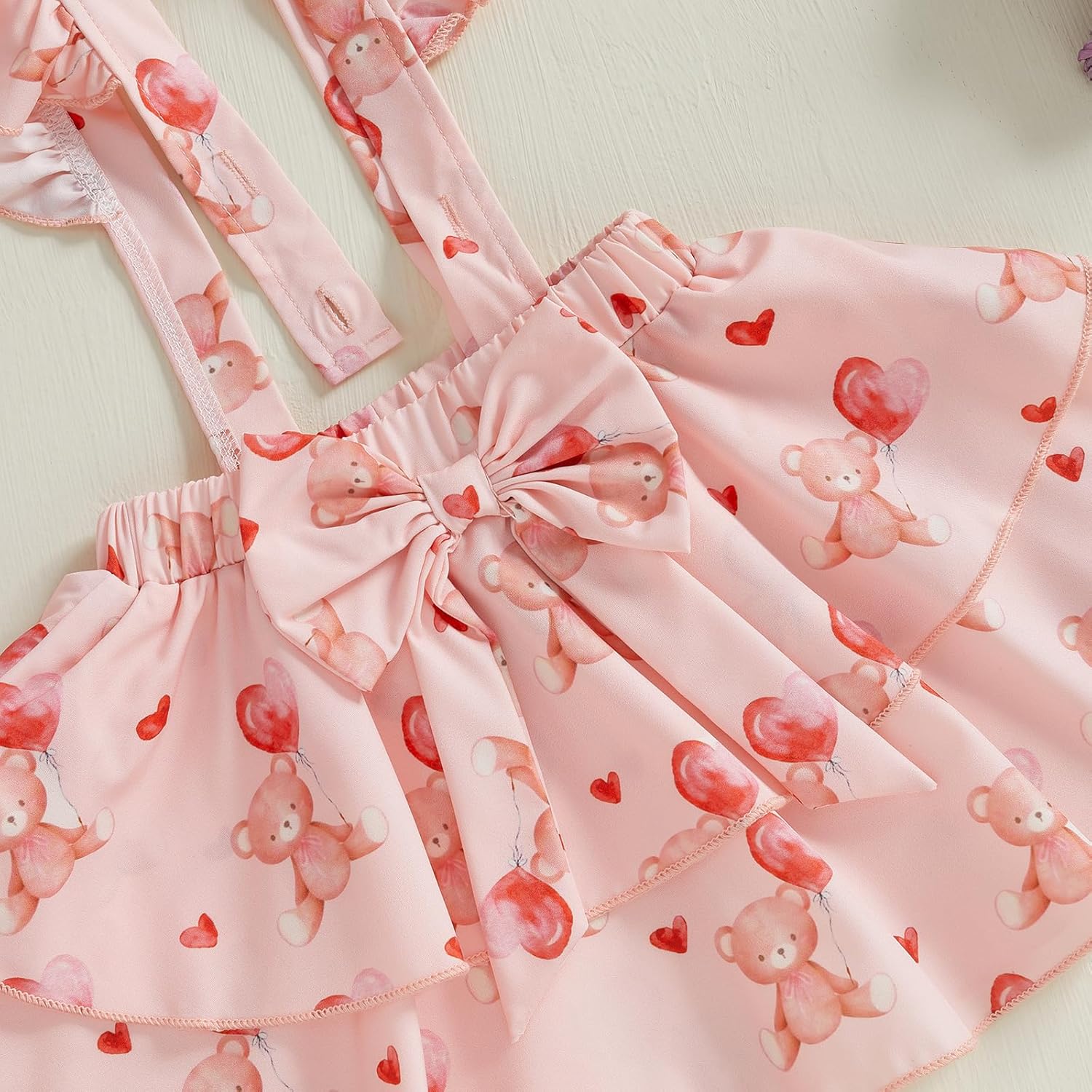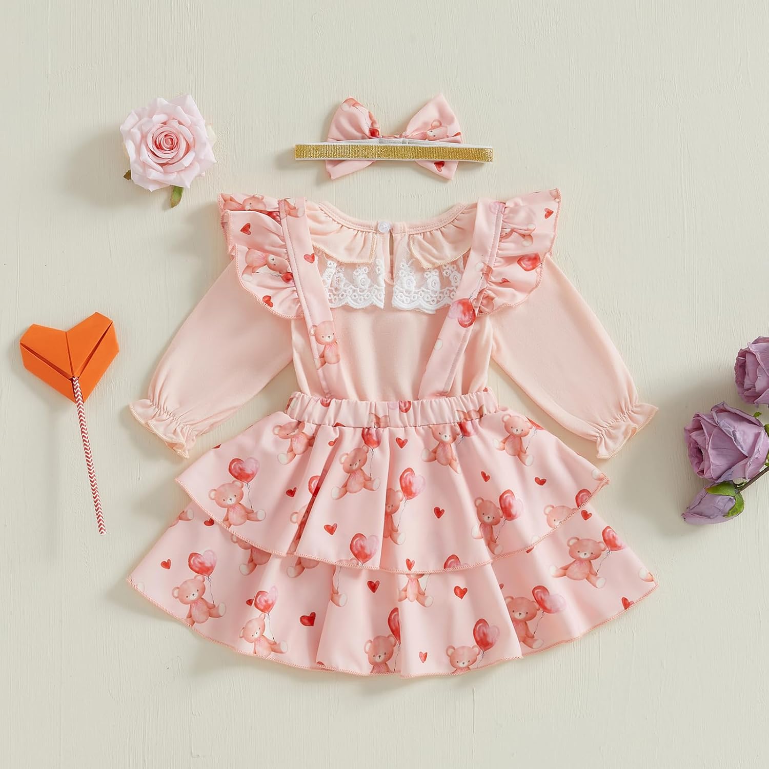 Valentines Day Baby Girl Outfit Lace Ruffled Long Sleeve Romper Bear Print Suspender Skirt Infant Girl Valentines Day 3Pcs (A-Pink,3-6 Months)