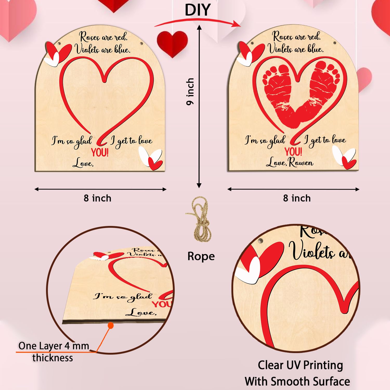 💖 ONE LAYER WOODEN HANGING SIGN: this Baby’s First Valentine’s Day Footprints, Valentines Day Sign is 8x9x0.3 inches, made of basswood, very colorful and lightweight, comes with a hanging rope, wooden base/stand, and bubble package. These Valentines Day Baby Shower Decorations, Valentines Day Props Sign will be blank and ready for sweet little footprints ( PAINT/ INKPAD IS NOT INCLUDED).