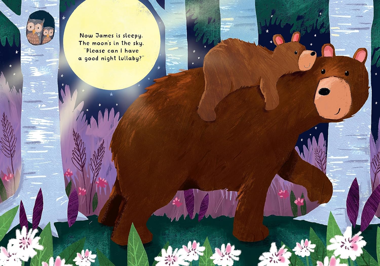 It’s time for bed, but James isn’t tired yet! Read along as James visits all the woodland friends to see how they get ready to fall asleep. James learns how the hedgehogs stretch, the foxes take deep breaths, and the bunnies cuddle up tight in their burrow. At the end of the night, Big Bear sings a good night lullaby and tucks James into bed, saying, “I love you, night night.” This heartfelt story combines a warm message of love with adorable baby animal illustrations and sweet rhyming text!