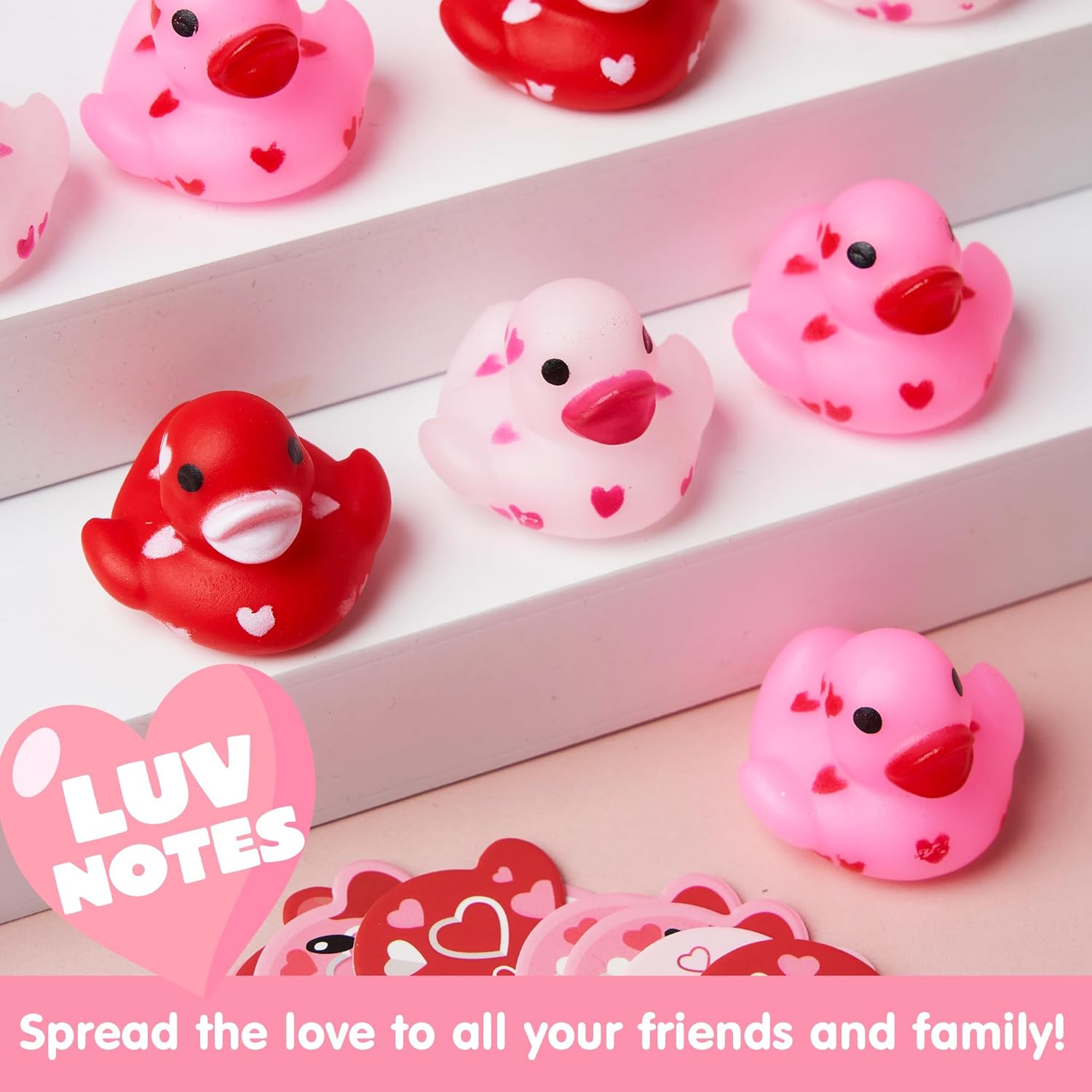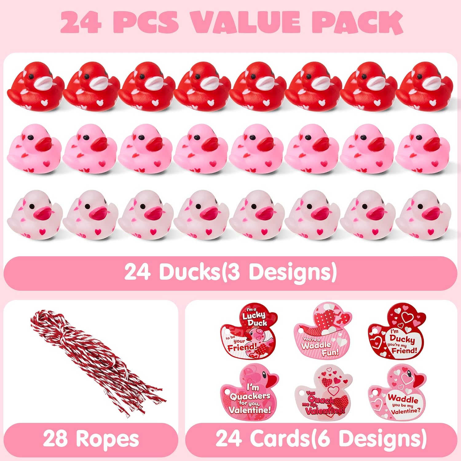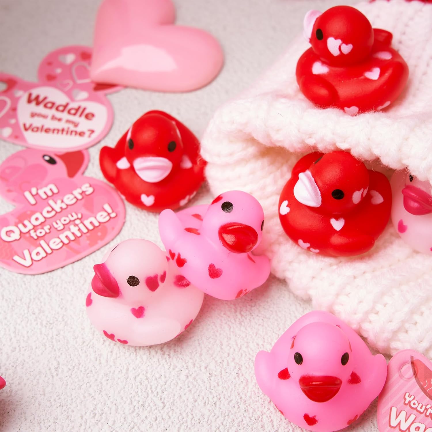 JOYIN 24 Pcs Valentine’s Day 1.1 Inches Mini Rubber Duck with Gift Cards, Small Rubber Duckies with Duck Card Tags, Rubber Duck Bath Toys for Classroom Exchange Prizes, Valentine Party Favors ToysSuper Value Pack.Our Valentine’s Ducklings set includes 24 gift cards with 24 ducklings in cute designs. They have a Valentine element and make a great Valentine’s Day gift.Unique Design. Our duckies will float in the bath upright,And, the rubber ducks have a special love pattern design, making bath time sweeter on Valentine’s day!Our Valentine Favors set brings the perfect Valentine’s Day spirit to your home! They’re adorable keepsakes that let your special pals know that you love them.Ideal Favor & Gift. The valentine’s day gift card comes with a rope for fixing on the duck, sturdy and reusable.You can write your blessings on the card.Great for gift options for kids’ school classroom prizes, gift exchange, love notes and more!Premium Quality & Safety. Made of high quality rubber. Child-Safe: non-toxic, non-BPA. Meet US toy standards. Safety test approved.
