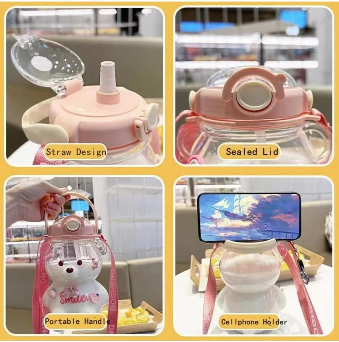 With Ajustable Shoulder Strap:Bear Water Cup comes with a detachable shoulder strap and handle, a safety lock design to ensure no water leaks during shaking, and can also be used as a mobile phone holder on the desktop to provide more convenience for your travels.