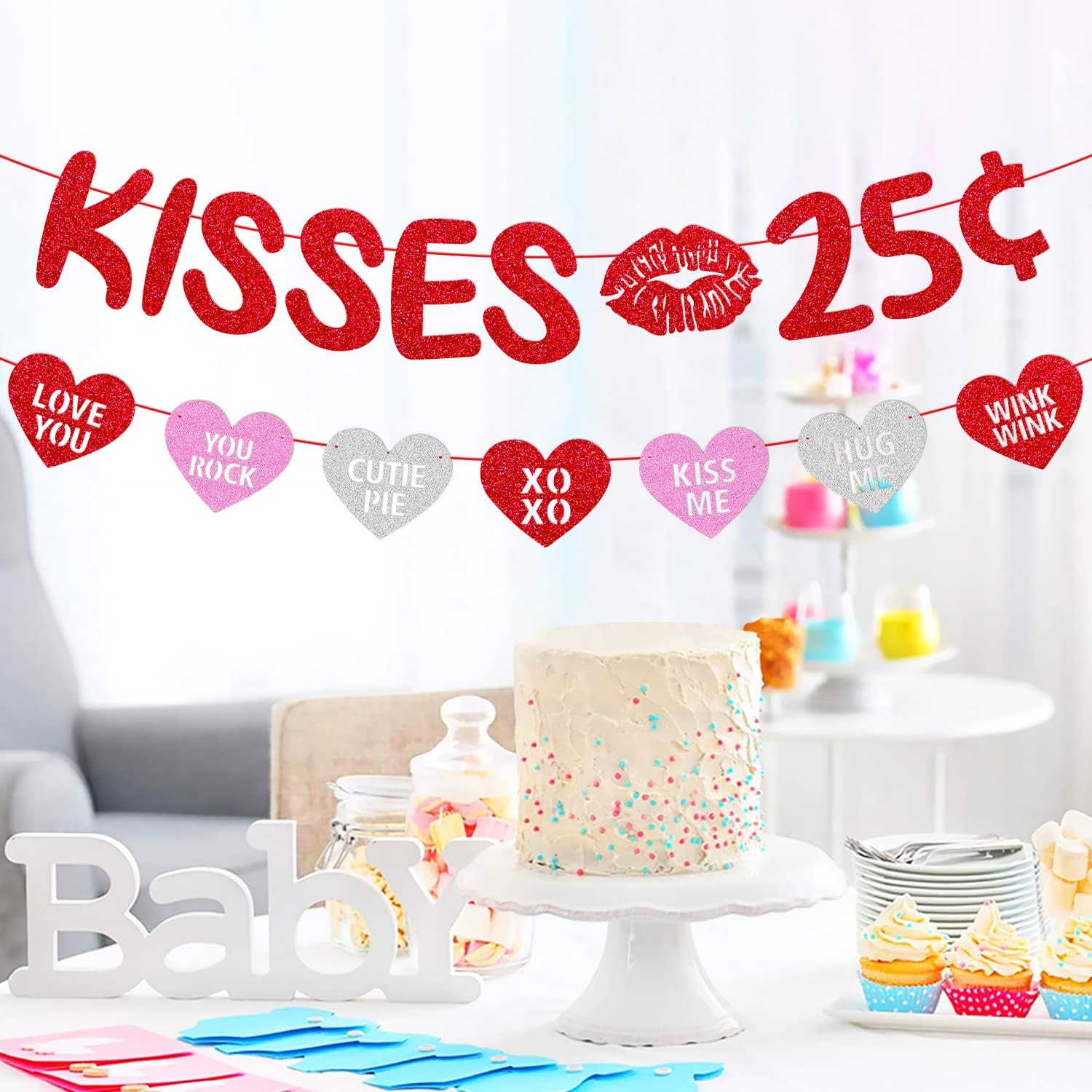 Good Quality: Kisses 25 Cent Banner with Sparkle red and pink heart garland is made from premium quality card stock, the glitter won’t shed off. Taking pictures under the flash will be more beautiful.