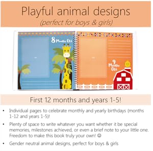 CAPTURE YOUR BABY’S IMPORTANT EARLY MILESTONES: Included inside is an intuitive guide through the first year with monthly birthday pages, milestones such as first tooth/first meal, family vacations and many of the major holidays in between (DETAILED LIST BELOW)! In addition, there are individual pages for years 1-5 to truly capture your baby’s growth into a toddler to remember for years to come. Perfect gift for baby showers!!