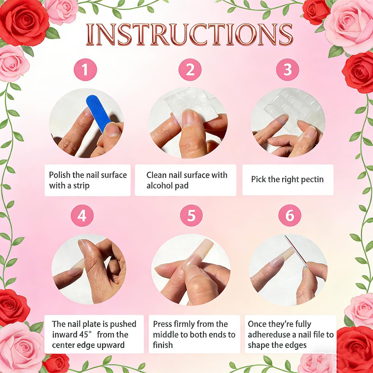 【Complete Set】In one box, you’ll get 24 pink rose false nails, a sheet of 24 jelly glues, a nail file, a wooden stick and an alcohol pad. Everything needed for applying and maintaining the nails is provided