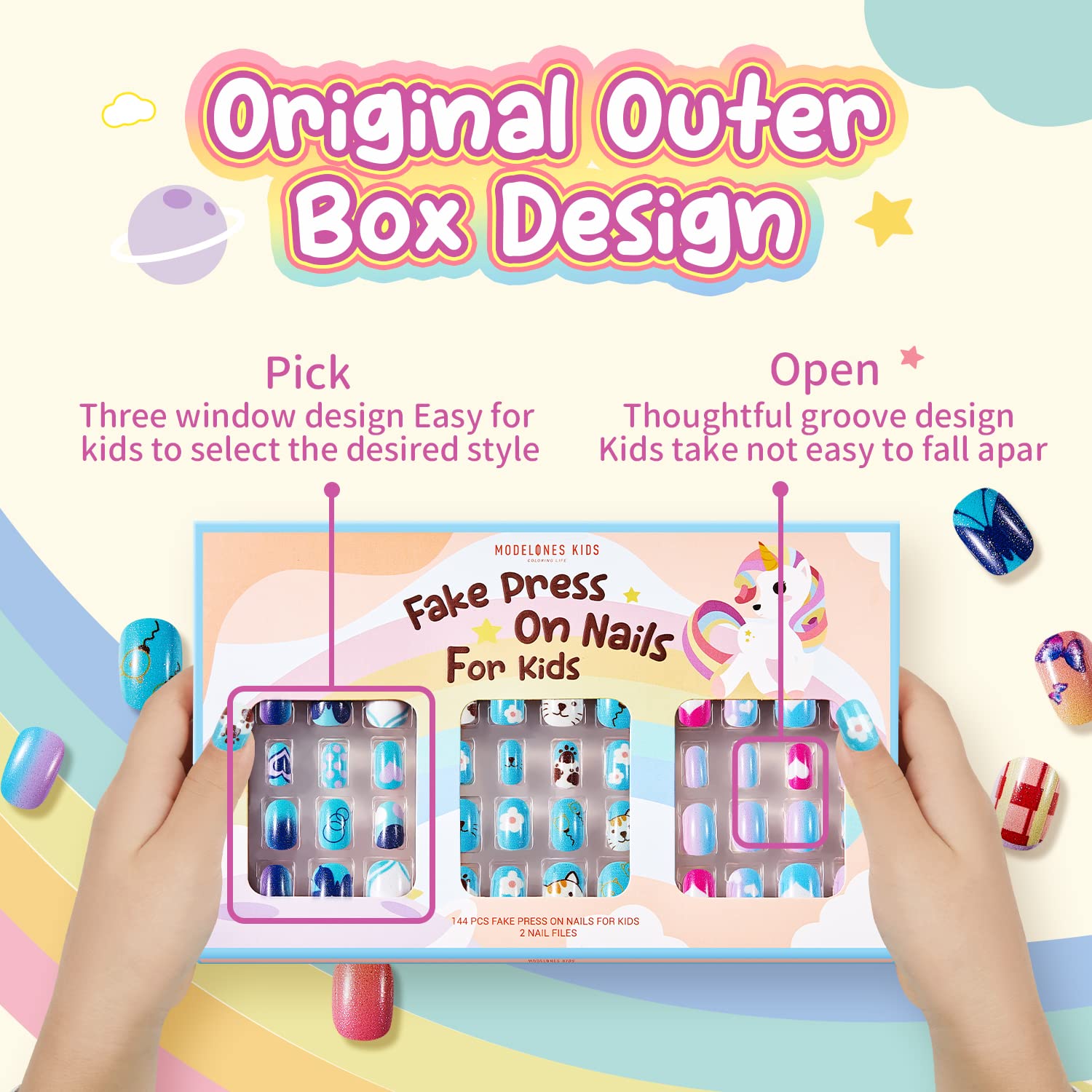 【Press on Nails for Kids】 Modelones girls fake nails set contains 144 pcs children press on nails of assorted sizes and patterns, ideal for the girl’s nail art decoration. Easy for kids to DIY various nail art styles every day to meet the different dresses’ needs