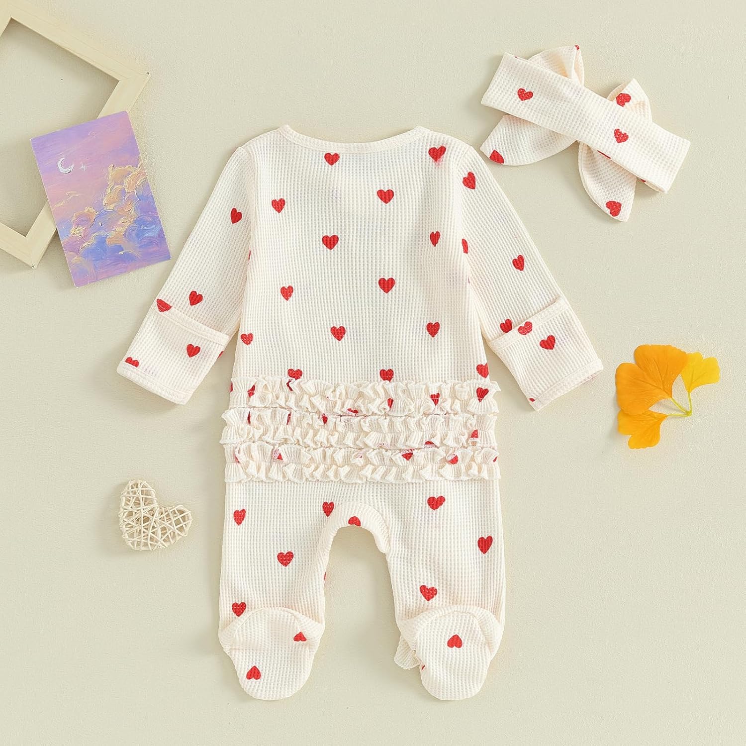 Newborn Baby Girls Valentine’s Day Jumpsuit Long Sleeve Crew Neck Heart Print Ruffle Zipper Romper with Headband