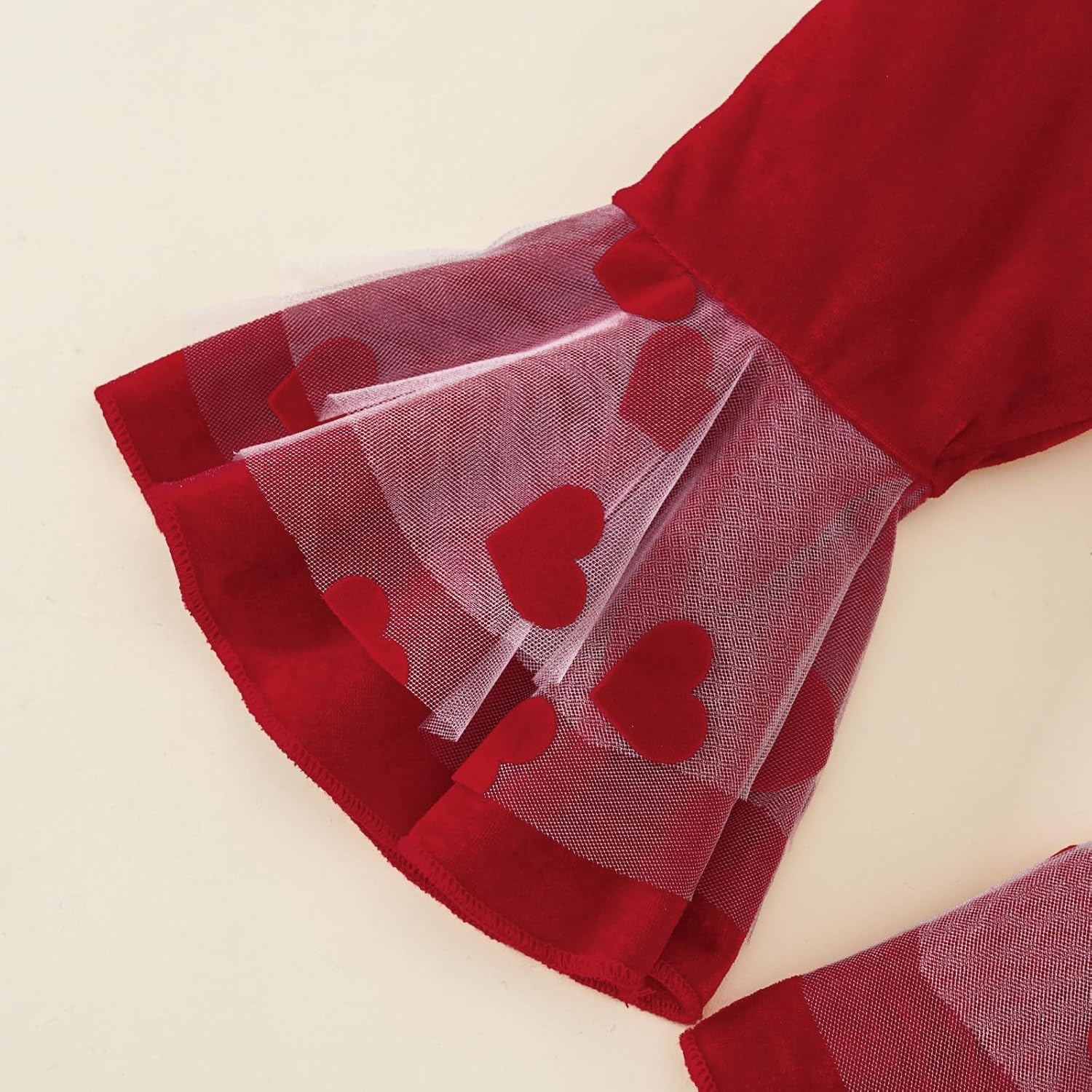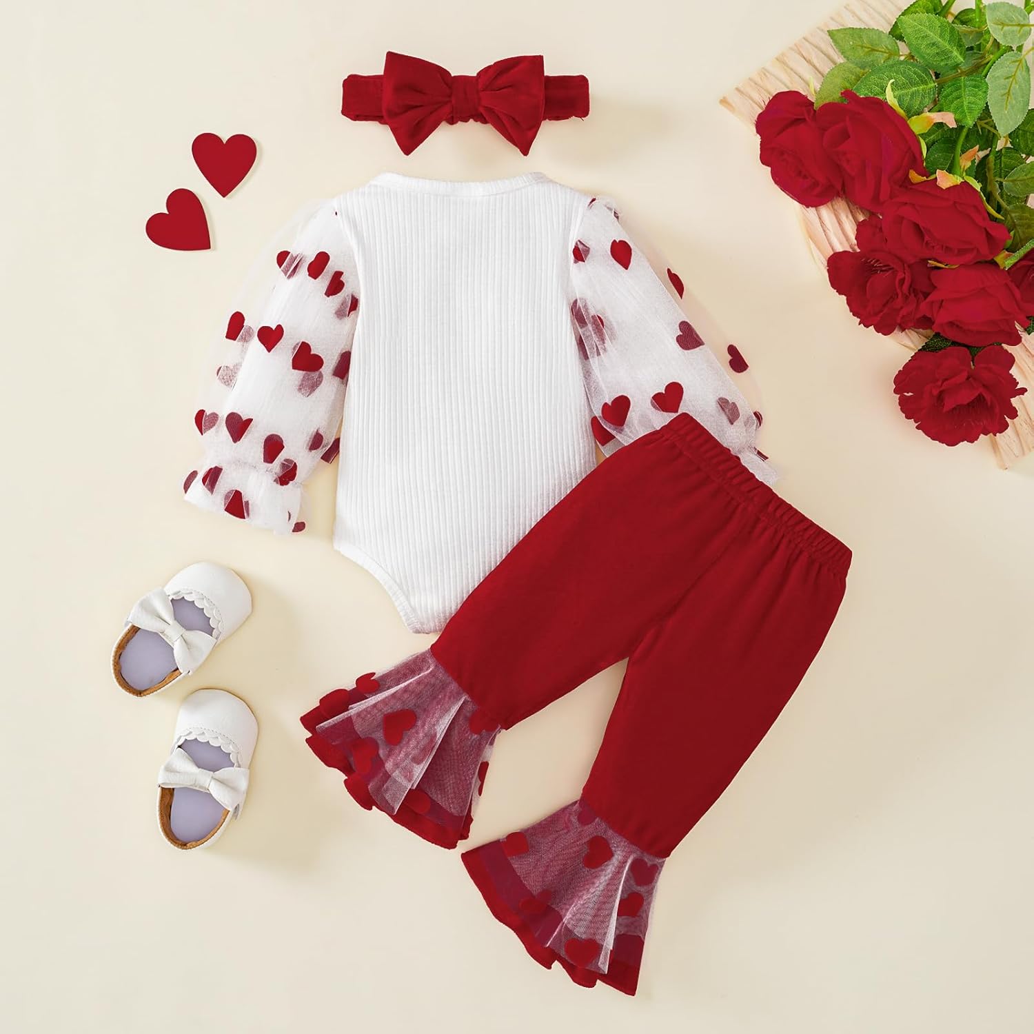 My First Valentines Outfits Newborn Baby Girl Outfits Puff Sleeve Love Heart Print Romper Flare Pants Headband