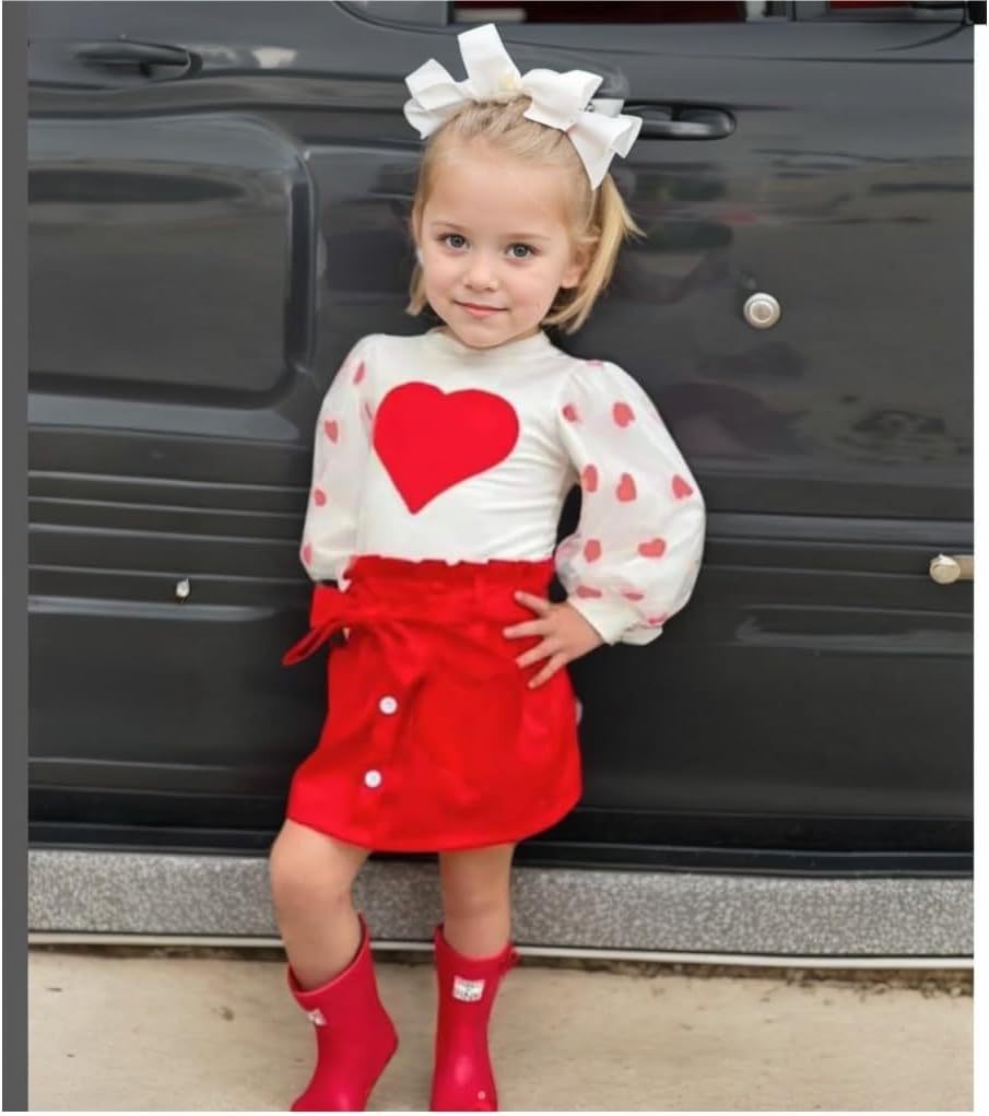 Toddler Baby Girl Valentine’s Day Outfits Heart Sweatshirt Red Skirt Set Kids Spring Clothes
