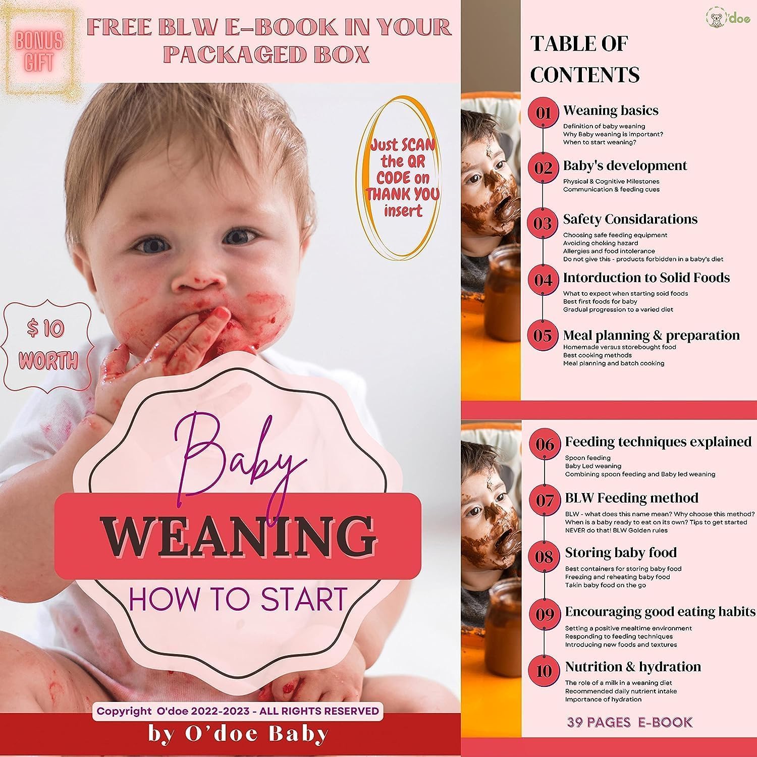 SELF FEEDING SET: BLW E-book 11-piece baby feeding set contains 1 x baby suction plate, 1 x suction bowl, 1 x toddler spoon, 1 x sippy cup, 1 x sippy cup straw with lid, 1 x snack cup lid, 1 x baby bib with catcher, 1 x first stage toddler fork, 1 x first stage toddler spoon, 1 x weaning spoon, and 1 x finger toothbrush cover. Designed to cater to all your baby’s mealtime needs.