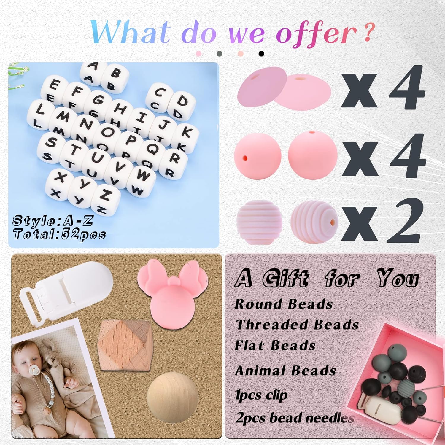 【Enough Accessories Set】The personalized pacifier clip set includes: 2 Set letter beads(Full A-Z),1 pcs pacifier clip,1 roll of 2 meters string,4 pcs round beads,4 pcs flat beads,2 pcs threaded beads,2 pcs beech beads, and 1 pcs animal bead.Fully meet your needs for DIY.