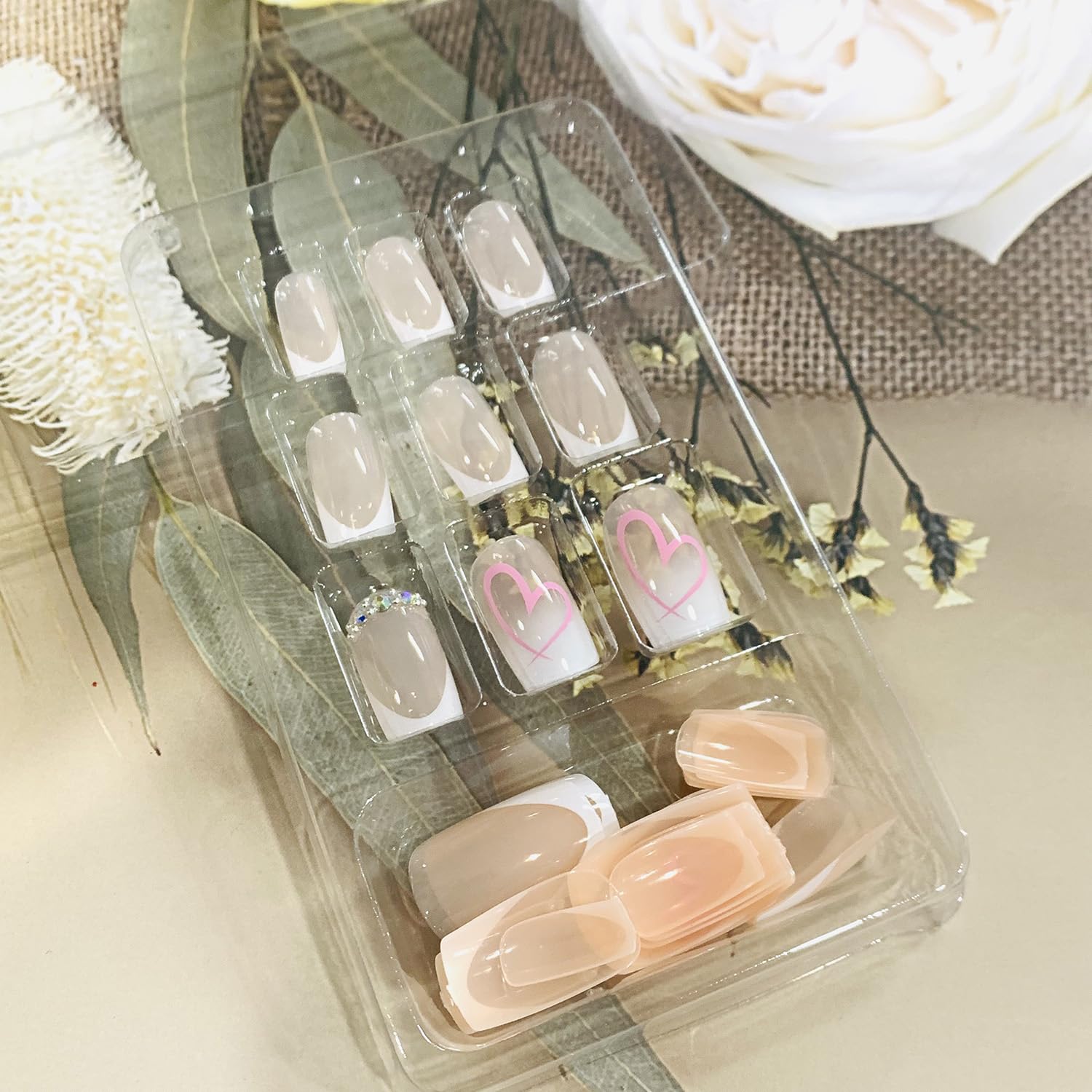 Package: You’ll get 24 french Valentine’s Day false nails in 12 sizes. 1 mini nail file, 1 small wooden stick, 1 piece of nail glue sticker. Heart glue on nails are perfect for most people’s nails