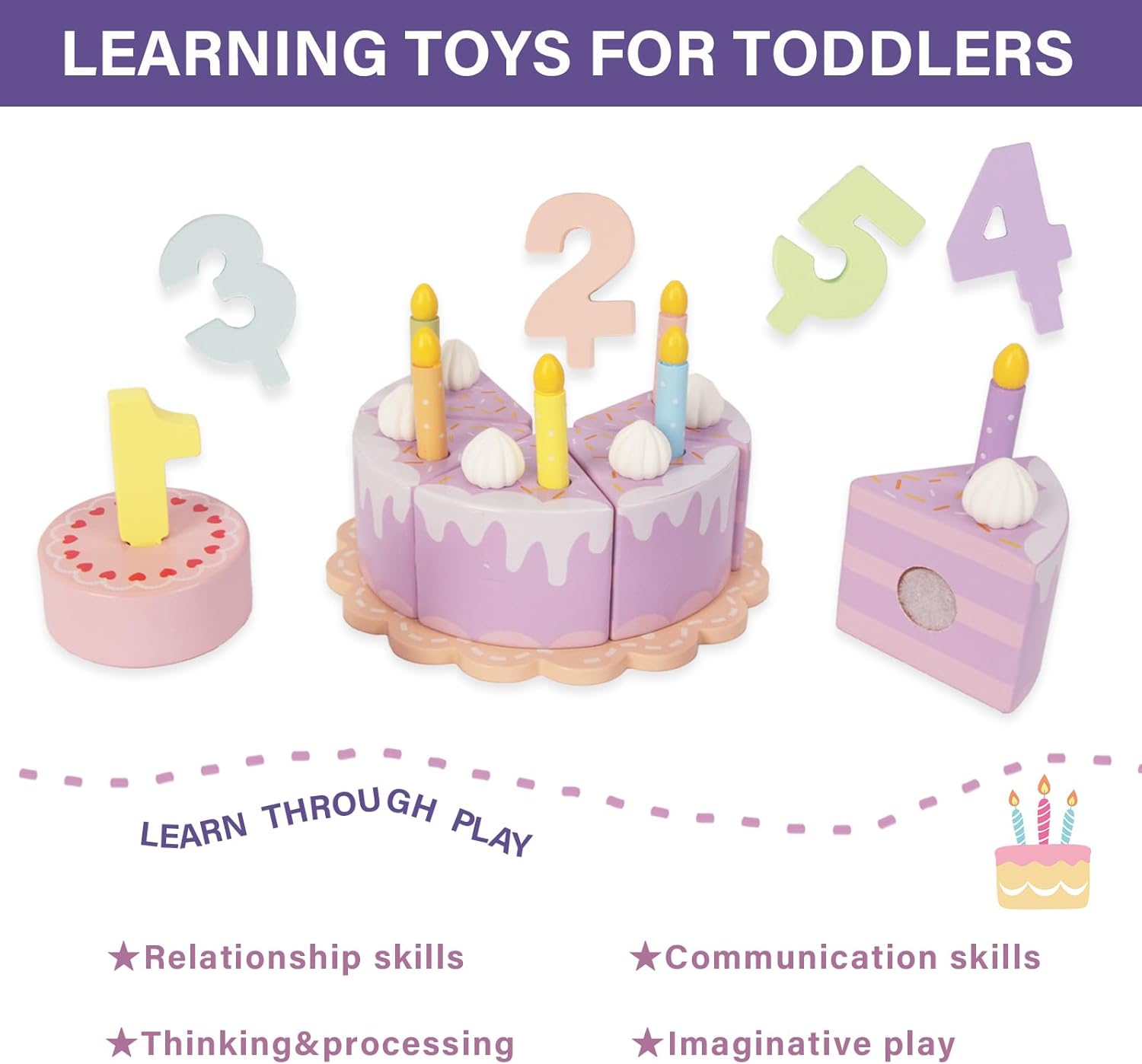 REALISTIC PRETEND FOOD TOY: The wooden toy includes tray, knife and different colorful numbers and cakes. Keep your kids busy while they pretend a chef and play these toy kitchen accessories