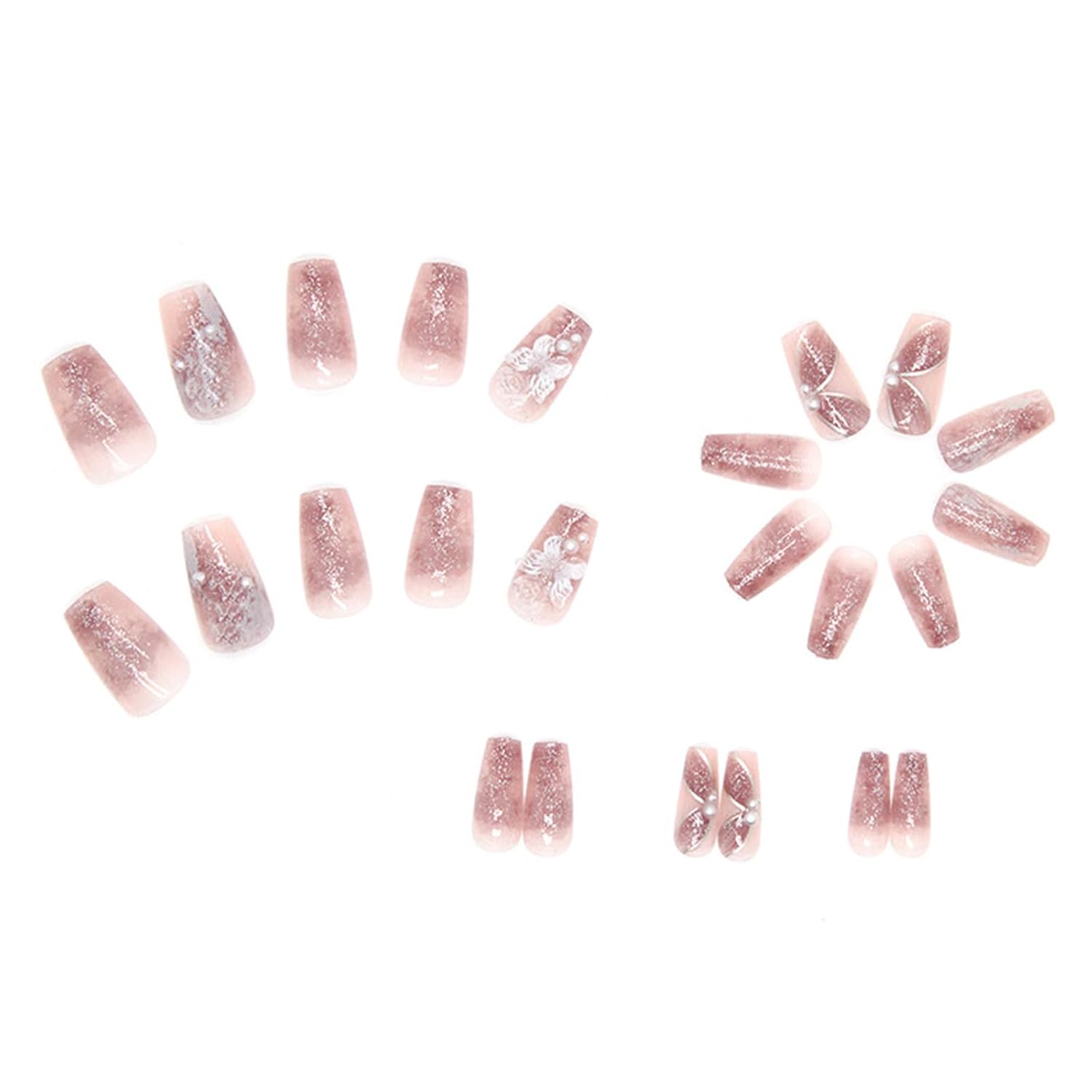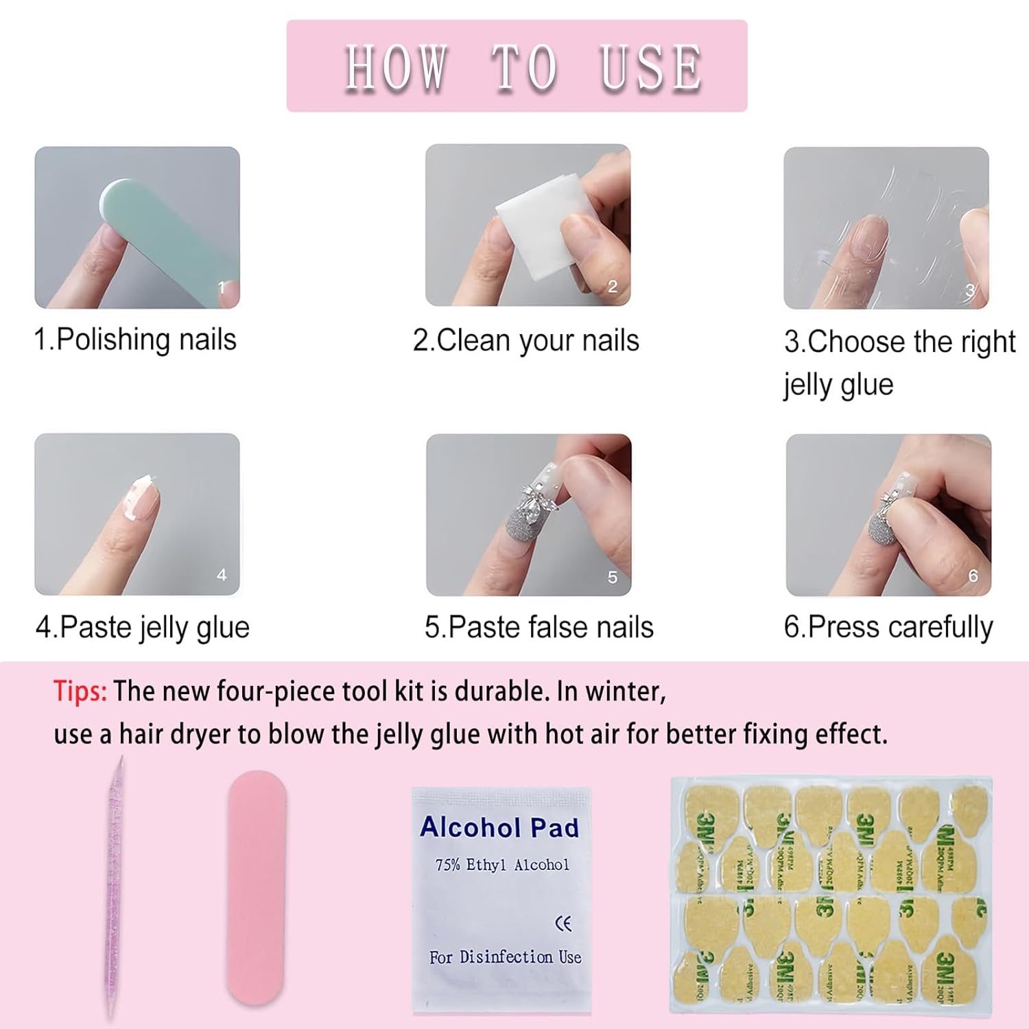 Packaging includes:You will receive 24 butterfly pearl fake nails, 24 jelly glue, 1 small wooden stick, alcohol bag, nail file, no additional tools required