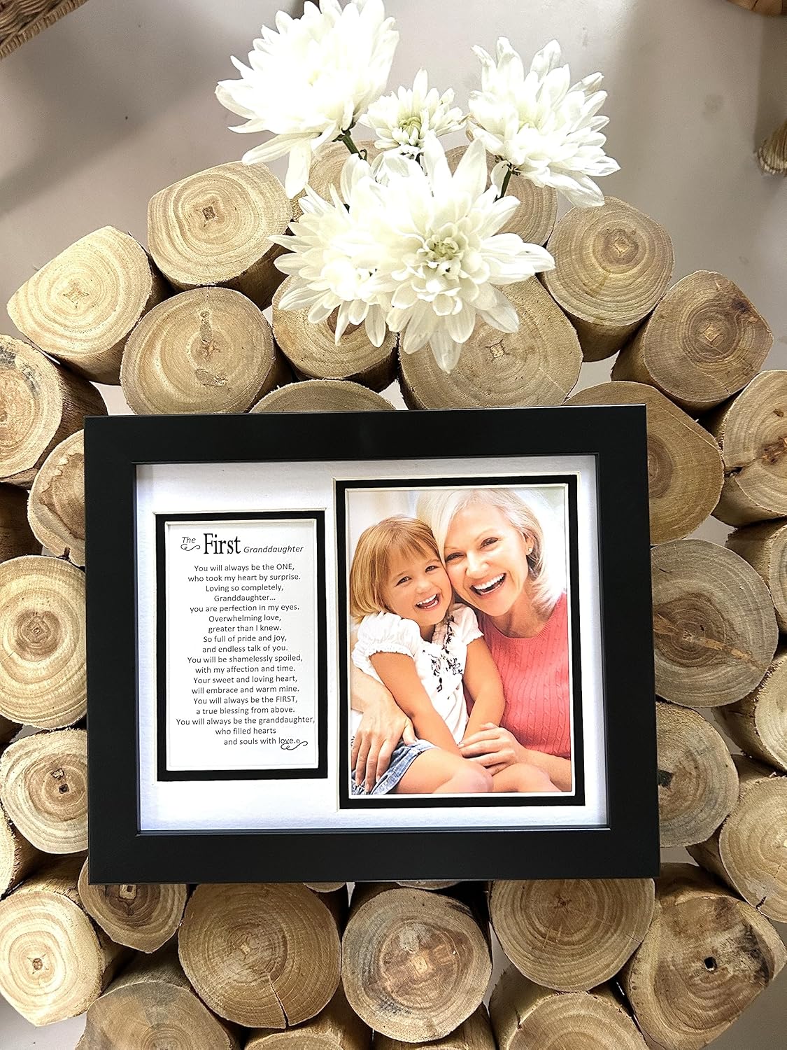 Any loving grandparent would be proud to display a treasured portrait of their first granddaughter along with an endearing poem. 8×10 table top or wall frame includes space for a 5×7 photo and first granddaughter poem. The 8×10 black frame comes with a double white and black mat. Made in USA.
