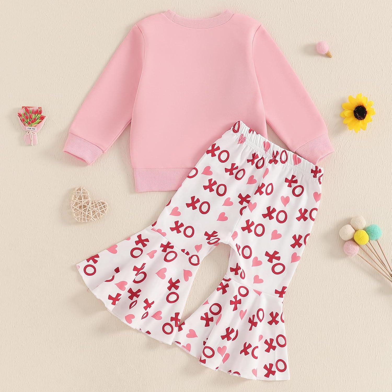 Toddler Baby Girl Valentines Outfits Embroidery Crewneck Sweatshirt Heart Bell-bottom Pants Set Valentines Day Clothes
