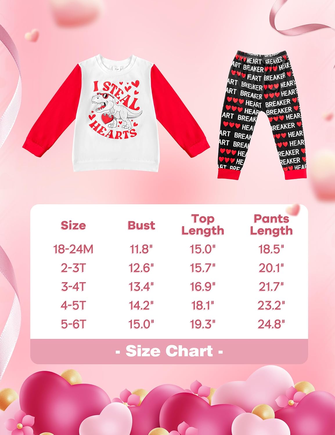 Adorable two-piece set for toddler boys on Valentine’s Day, featuring a long-sleeved top with cute “I steal hearts” letter print and dinosaur pattern.