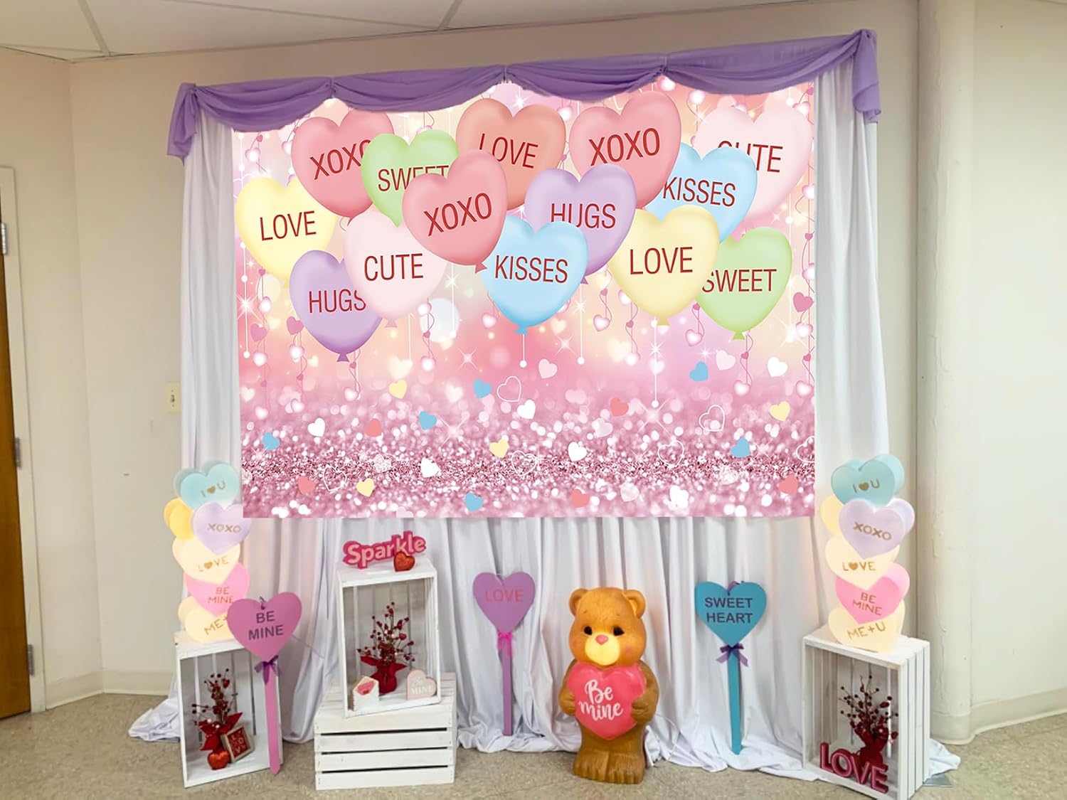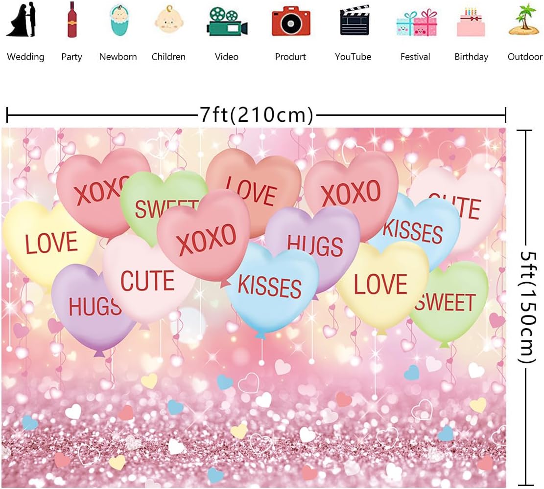 【Occasion】: This Valentine’s Day Sweethearts Candy backdrop, is perfect for family parties, couple events, photo shoots, and group photos, creating a romantic atmosphere with ease.
