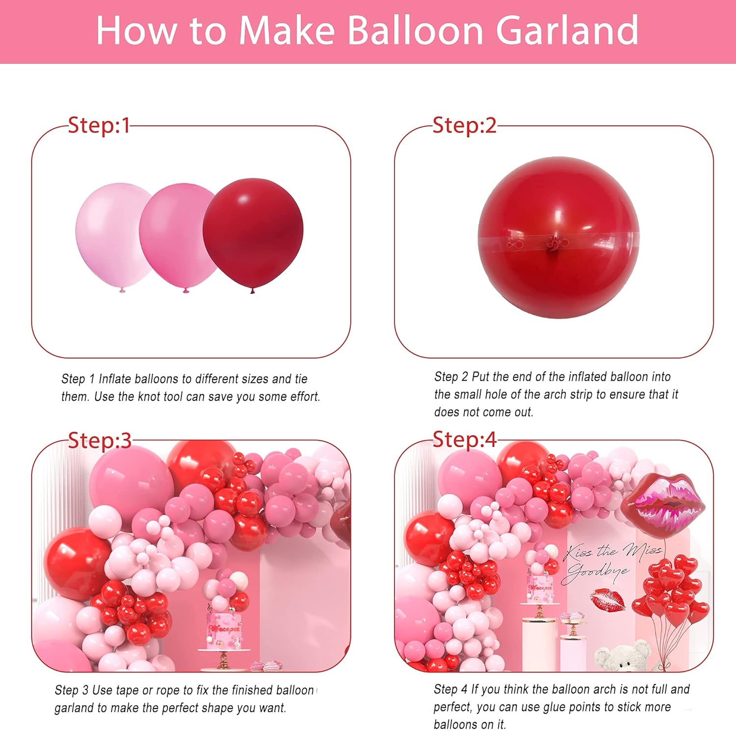 Packaging Includes – 5inch (red×10, macaron pink×10), 10inch (red×15, macaron pink×15, retro pink×15, heart×8), 12inch (red×15, macaron pink×15), 24inch (red×2, macaron pink×2, retro pink×1), 30inch lip×1. Whole Balloon Garland Accessories Kit: 16ft long balloon decorating strip tape×1 + 100 pcs glue×1, ribbon×1.