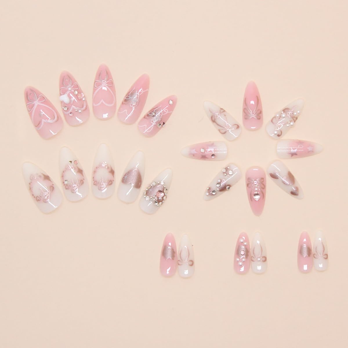 Package: 24Pcs Bow heart press on nails, 24 pieces of jelly glue, 1 mini nail file, 1 wooden stick; jelly glue is not as strong as liquid glue, but it can make false nails reusable; Please use appropriate glue according to different occasions