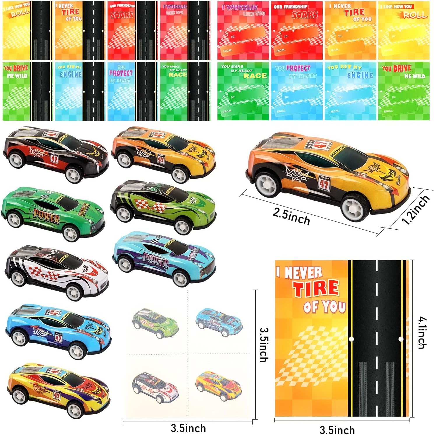 32 Pack Race Cars Valentines Cards & Pull Back Cars Toys & Temporary Tattoos – Funny Valentine Exchange Cards for Boys Girls School Classroom Gifts