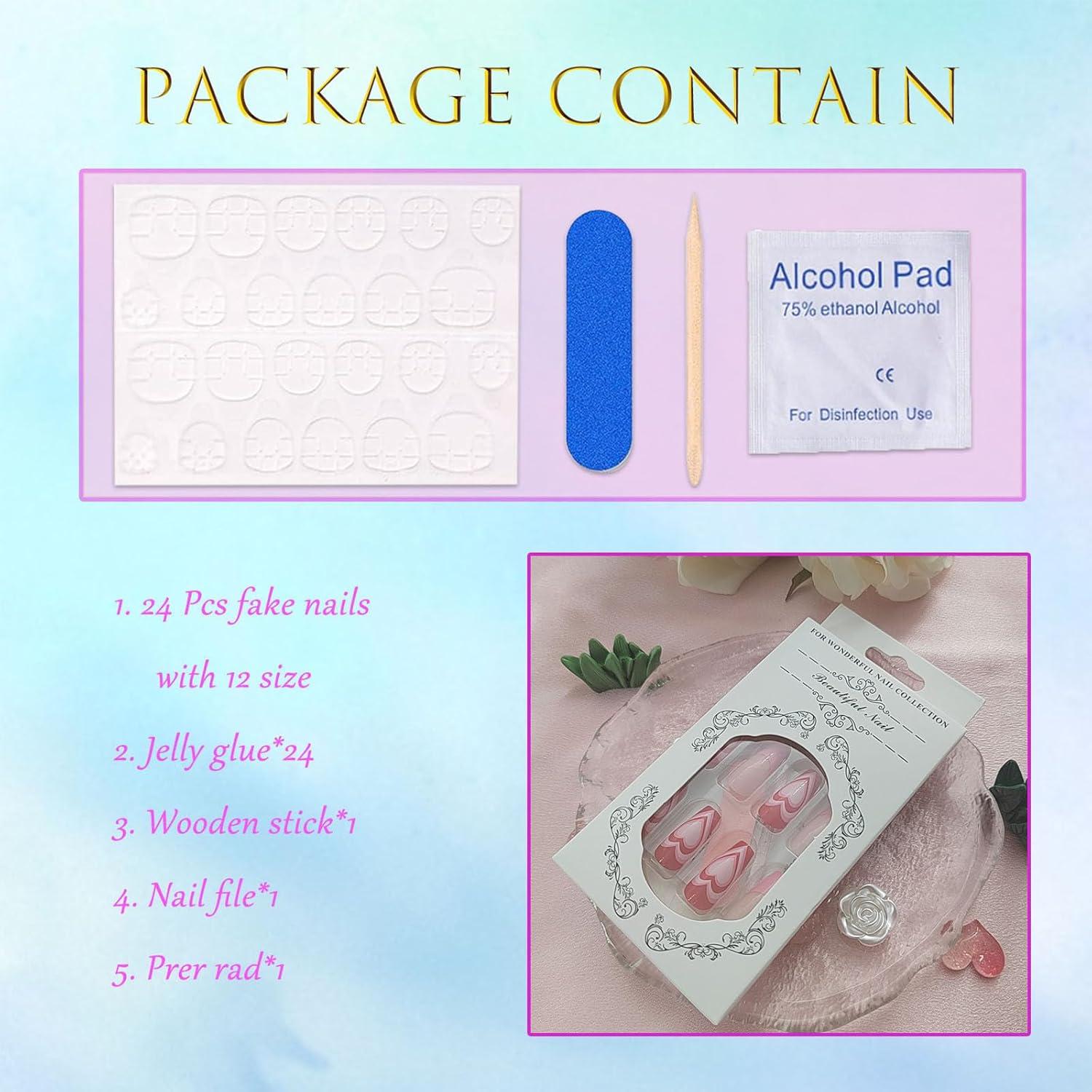 Valentine’s Day Nails: 12 nail sizes 24 Valentine’s Day fake nails ensure a totally custom fit, plus we give you everything needed just in case! Each set comes complete with a storage box, adhesive tabs, double-sided nail file, cuticle stick, and prep pad.