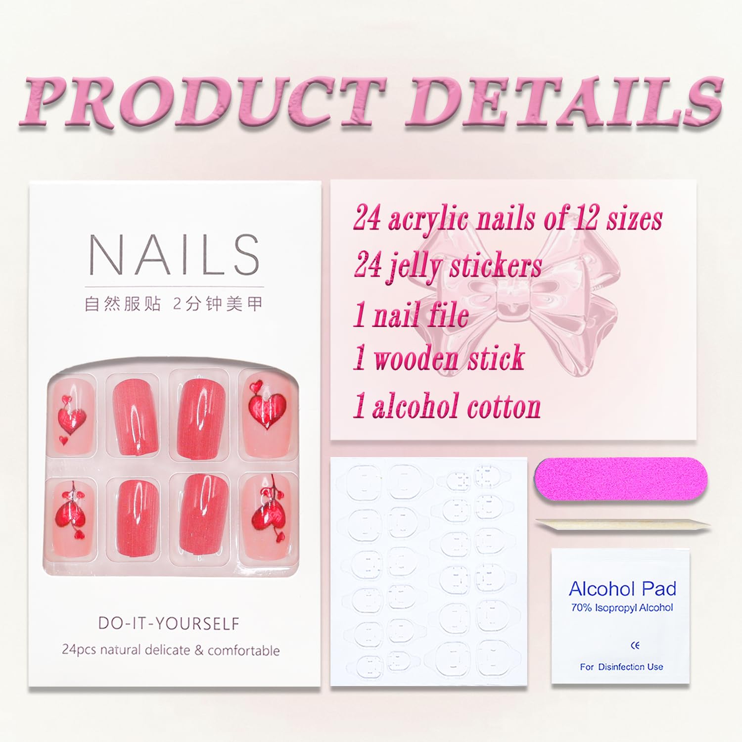 Package Content: You will get 24 Valentine acrylic nails of 12 sizes, 1 nail file, 24 jelly stickers, and 1 wooden stick for removing false nails.