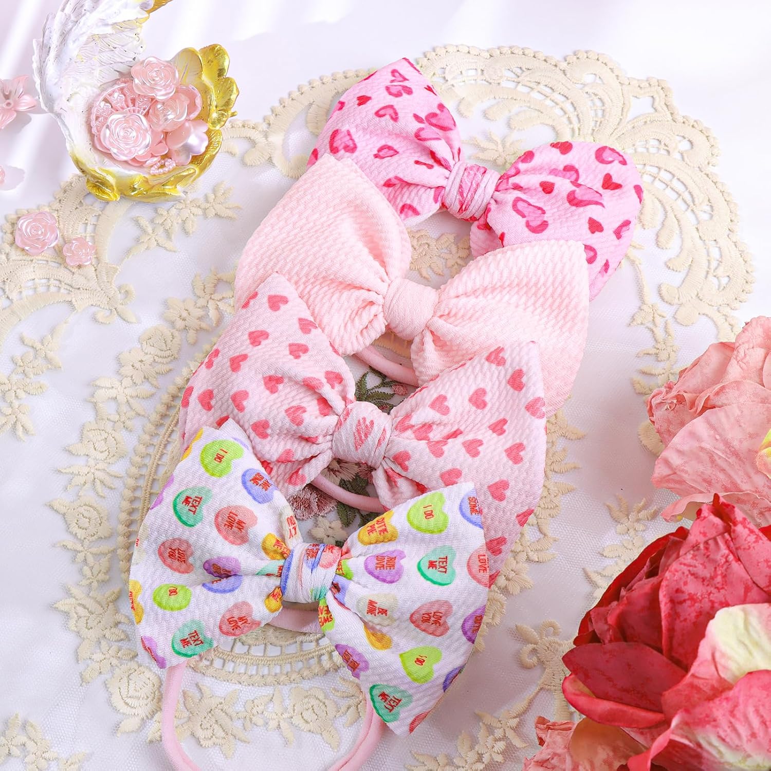 Contains 4 newborn headbands bows: A set of 4 different Valentines bow headbands for toddlers. All baby hair accessories are handmade with love. Every cute baby bow and children’s headband is perfect for Valentines and daily.